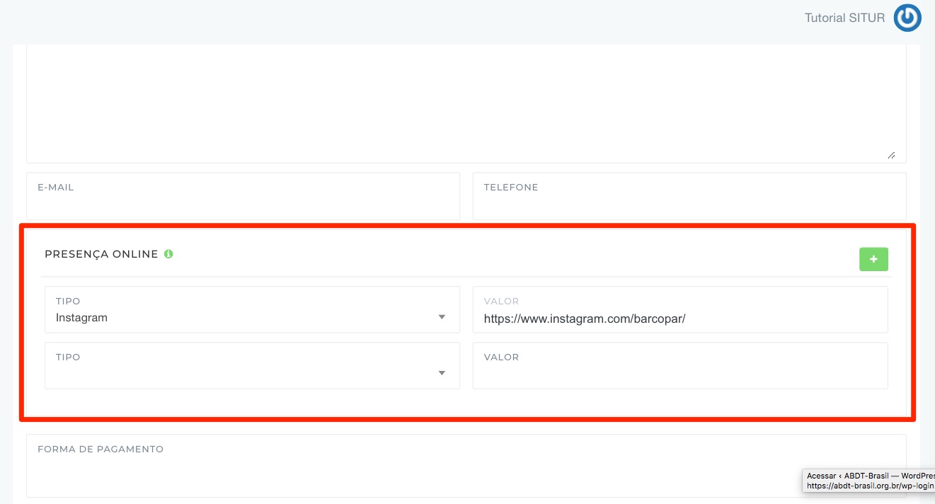 10. Insira no campo Presença Online os endereços dos canais na internet em que o seu Posto de Combustível está presente, ou seja, possui página ou perfil.